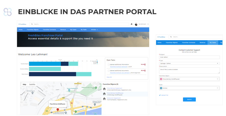 Unser Partner-Portal dient als zentrale Anlaufstelle für Franchisepartner. Hier können Standortdaten, wie Umsätze und Verträge abgerufen werden, offene Aufgaben eingesehen werden, Dokumente hochgeladen und Cases direkt mit einem Standort verknüpft werden. Dieses zentralisierte Tool erleichtert den reibungslosen Betrieb und schafft Transparenz sowie Effizienz im gesamten Franchise-Netzwerk.